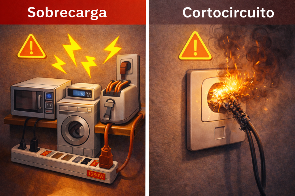Ocurre cuando la demanda eléctrica supera la capacidad del circuito. Ejemplo: conectar simultáneamente horno, lavadora y aire acondicionado.